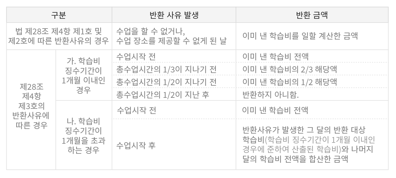 ※ 학습비 반환 기준 : 평생교육법 시행령 제23조에 근거하여 학습비 반환